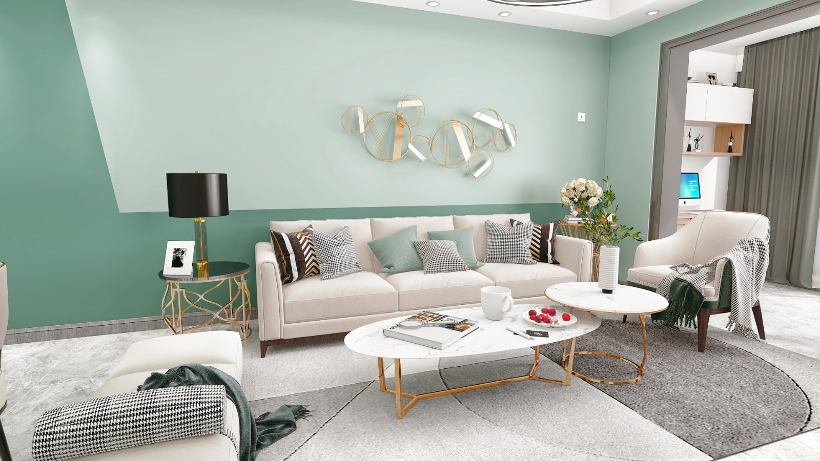 背景墙深绿浅绿相结合,富有层次感。
