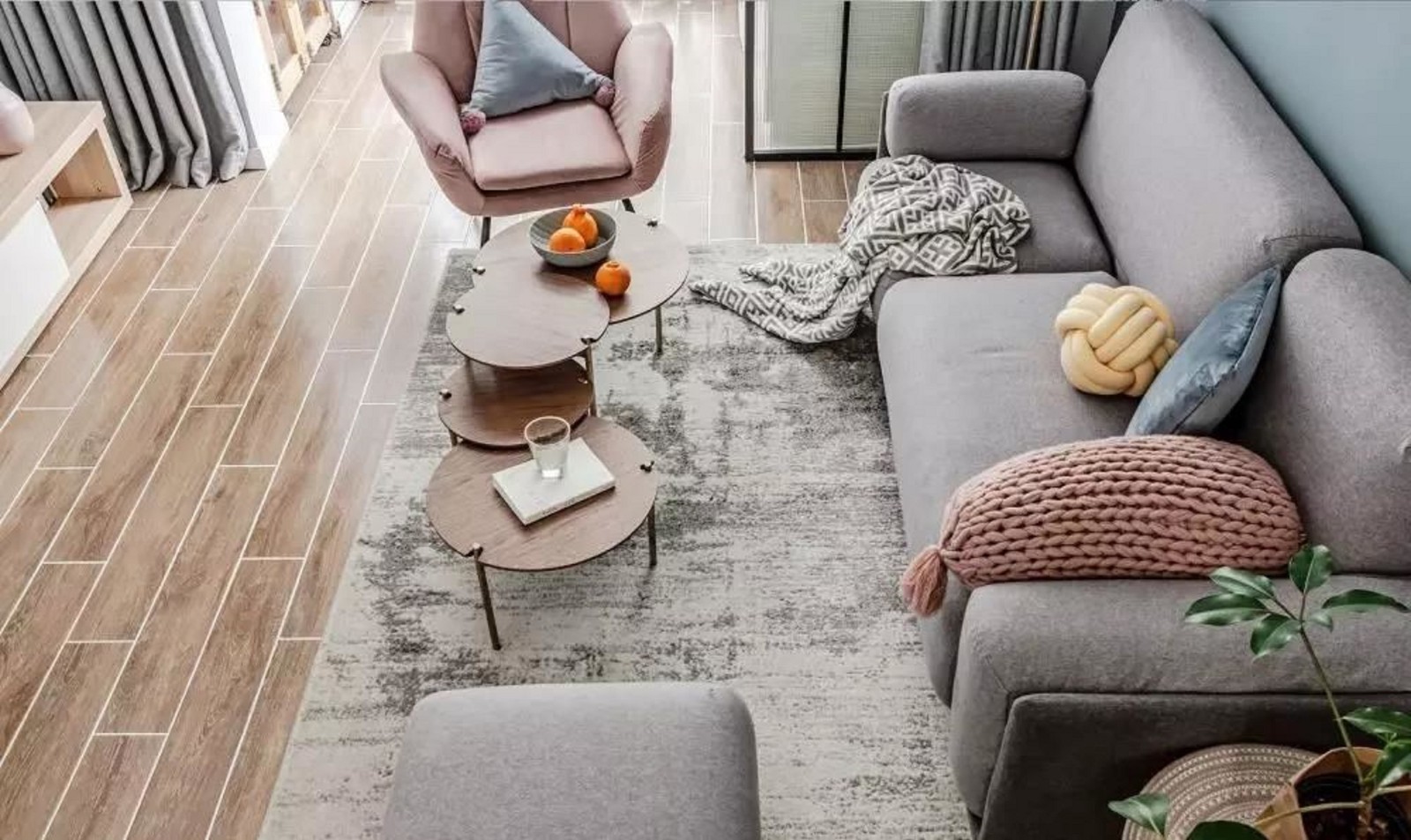 深灰色的地毯,浅灰色的沙发,浅蓝色的墙面,不同深浅色调的搭配让空间层次分明。暖黄色的加入能让原本冷酷的空间转换成为一个带有暖意、温馨的客厅。