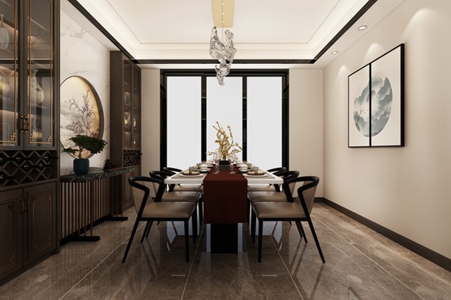 在颜色上与客厅统一色调,摆放六人位长桌,西墙两侧设置餐边柜,中间区域留白做小景观,以石材为基底,中间做圆型镂空,附中式山水画,下面摆放玄关柜。