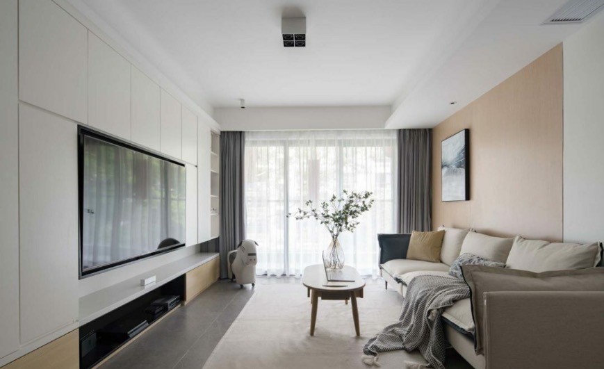 布艺沙发和原木色调的背景墙,与家具相互呼应,保持了空间的一致性,呈现一种舒适温馨,明亮通透的感觉