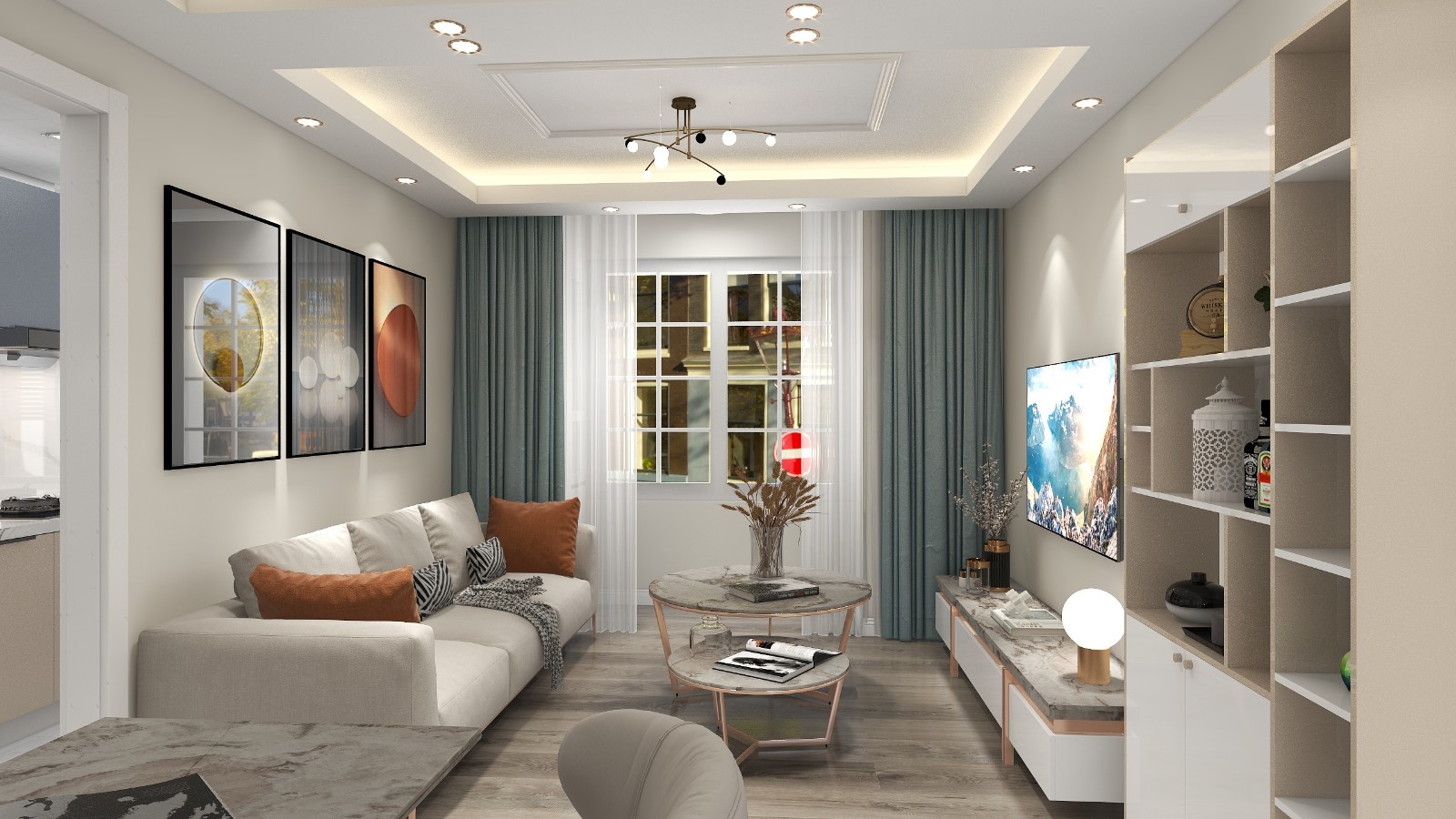 客厅是轻奢风,整体布局黑白灰,主要暖光调,地面灰色木地板,不会太冷暖光通透。