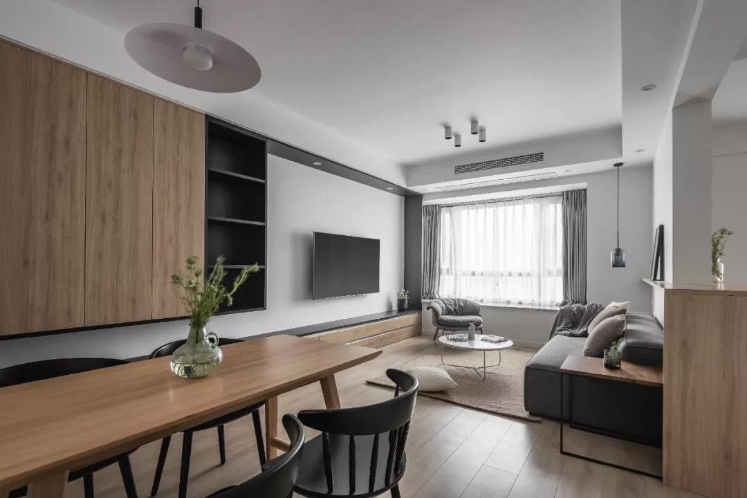 从入户开始做了整排柜子,鞋柜连接餐边柜,大大增加储物空间,木色+黑色搭配,让9米长的电视墙摆脱单调。