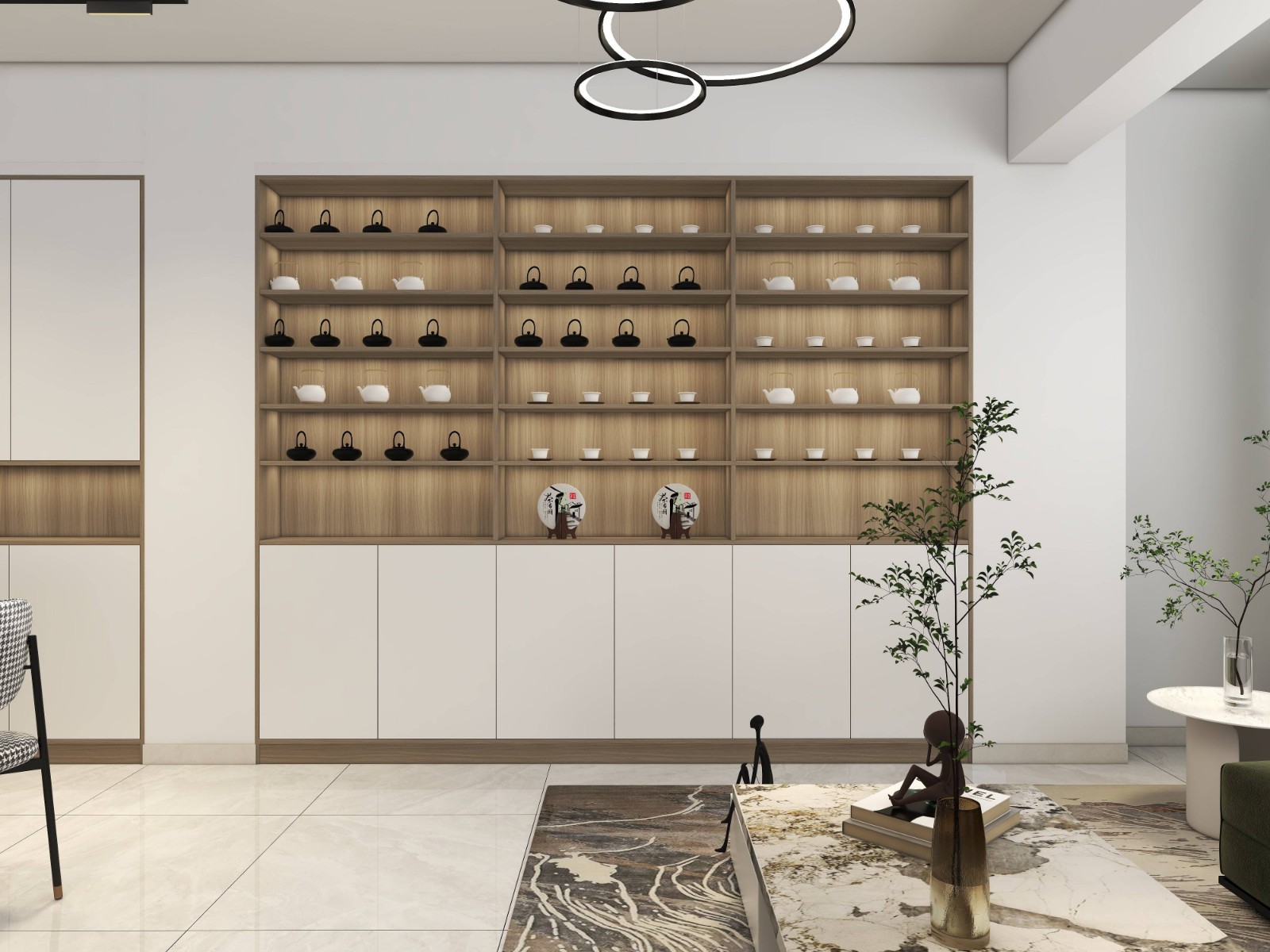 客厅有观赏的内嵌柜体,用于主人家摆放藏品。