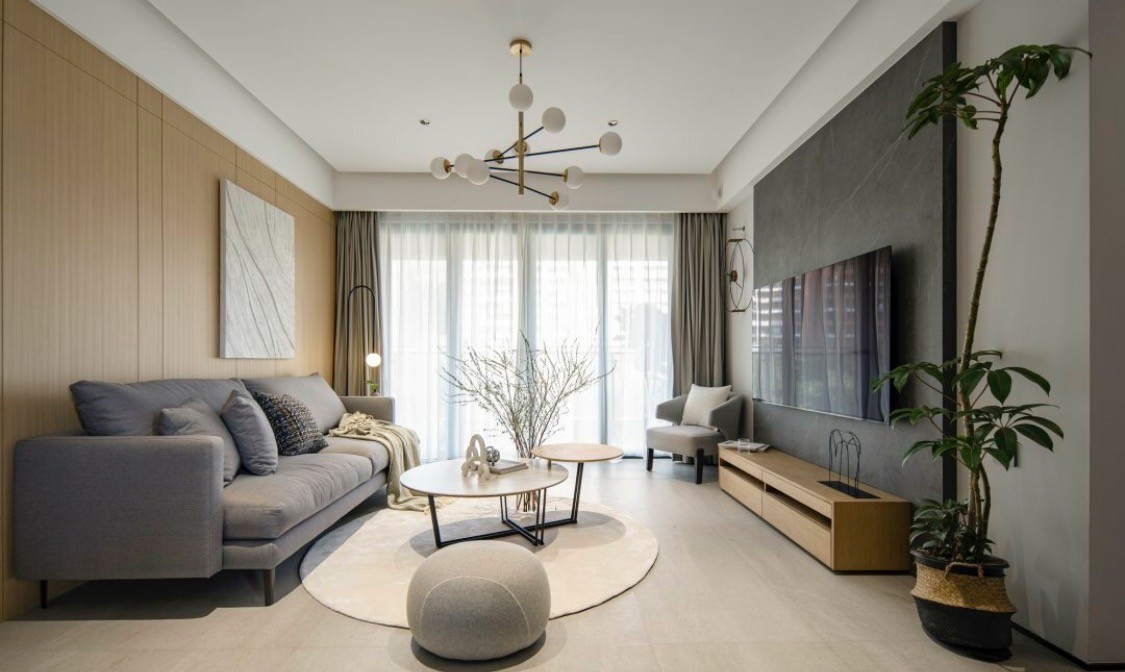 客餐厅为一个整体,两边的阳台通透让空间更加明亮。电视背景墙采用深灰的岩板+乳胶漆,两种材质结合,突出墙面的层次感的同时更具质感