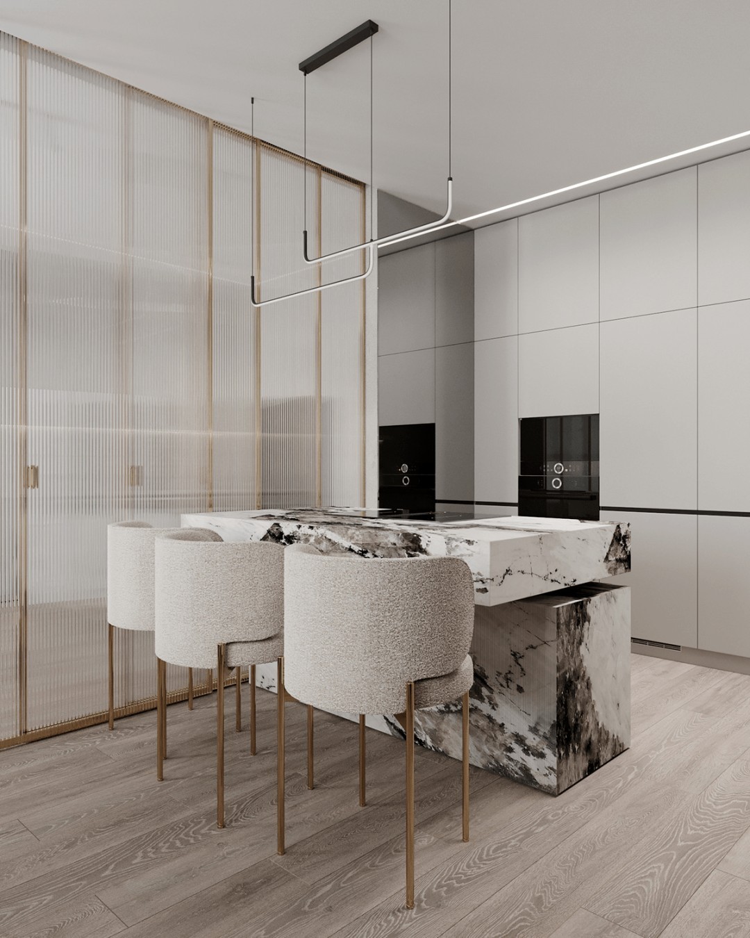 这个公寓面积为 109.7㎡,由 Olya Markova 设计。采用藕粉色为主色调,搭配大理石、原木等材质塑造***感。室内随处可见的直线设计,为淡雅的公寓注入力量感与理性气息。
