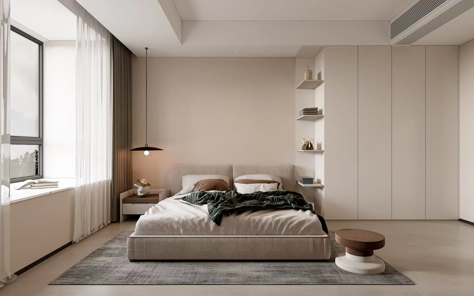 次卧整体延用了奶咖色系,整个空间宽敞而温馨。一侧做了顶天立地式衣柜,大气而满足收纳需求。