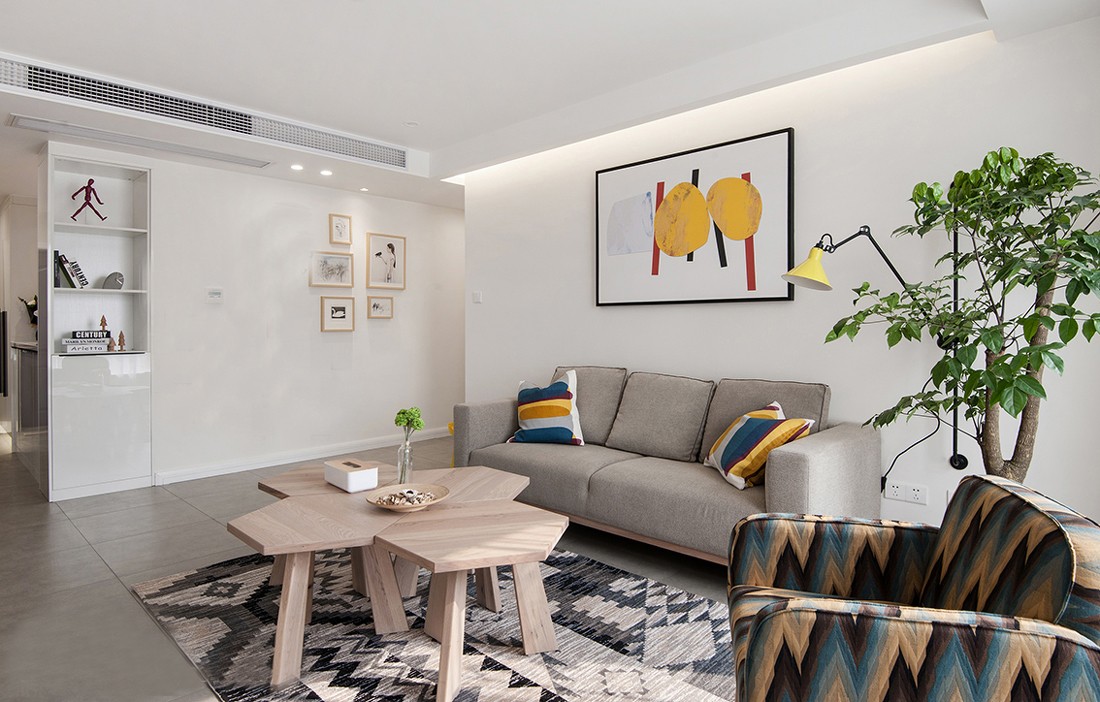 阳光入室,温暖整个空间。木质茶几造型独特,以几何造型拼接起来,搭配黑白亚麻地毯,营造出北欧风情。白色砖面背景墙上做了木质悬柜,方便收纳。