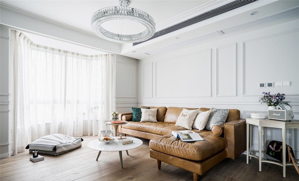 客厅墙色以白色为主搭配大面积的木地板,色彩可复古也可现代,非常耐看。沙发的棕色皮材质,深木色扶手以及做旧的金属脚,丰富了空间的质感。