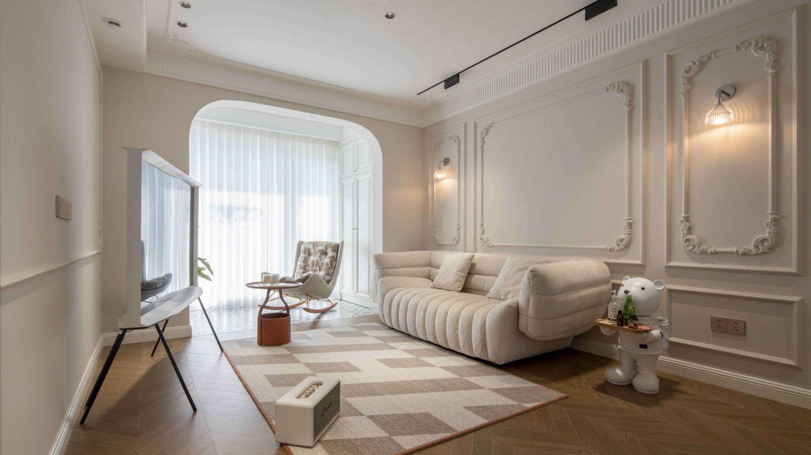 原木色地板+乳白色墙面,开放式设计,鱼骨拼接地板给空间无限延伸感。奶油色留白搭配无主灯布局,嵌入筒灯,见光不见灯的氛围感超棒。业主不想安装电视柜我们就想到了线条感强的移动式电视架,节省空间,也比较省钱,还很好看,完美解决了大家客厅要不要放电视的问题。客厅到阳台我们选用双拱形门的设计,使整个客厅线条看起来更加柔和。