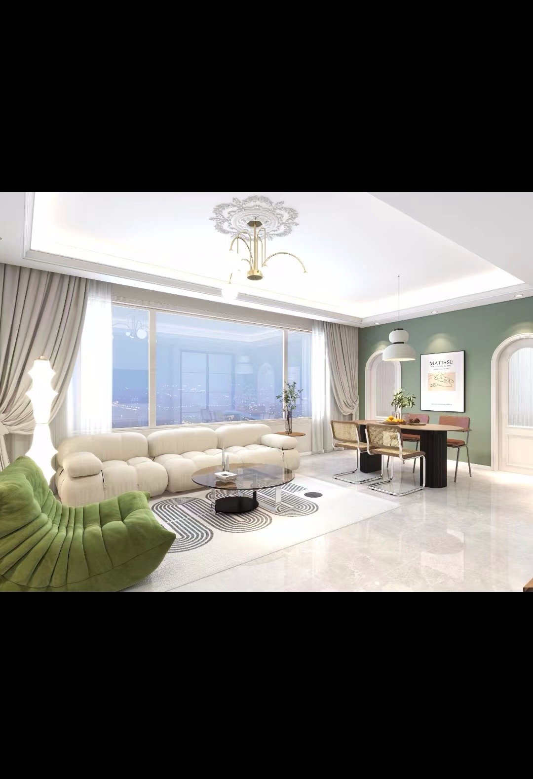 大面积使用白色为底色,床头为复古绿,形成强烈的对比