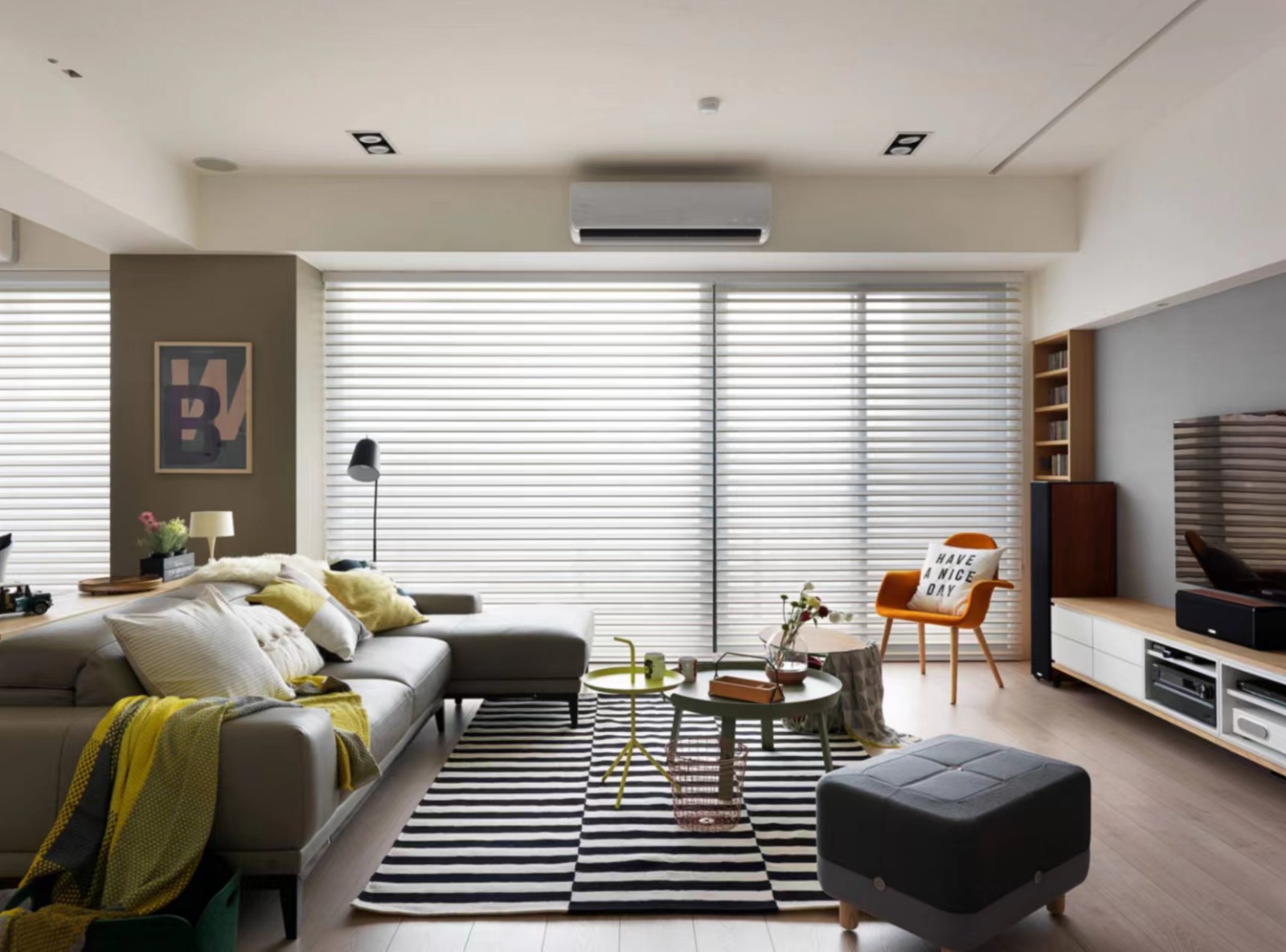 整面的百叶窗设计,保护业主隐私的同时,让光线充足入室,使得空间明亮而干净。灰色沙发搭配黑白条纹地毯,显得现代而有艺术感。