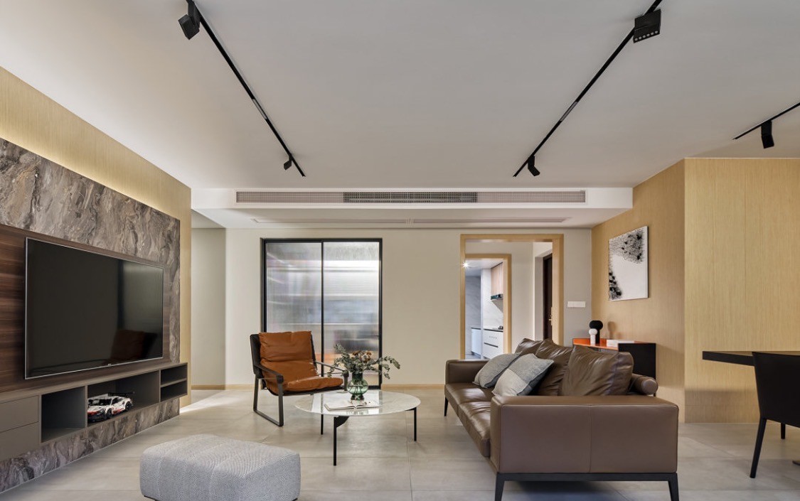 客厅用大面积的天然橡木木皮材质覆盖,纹理上增加了一些横纹,温馨中不失质感。