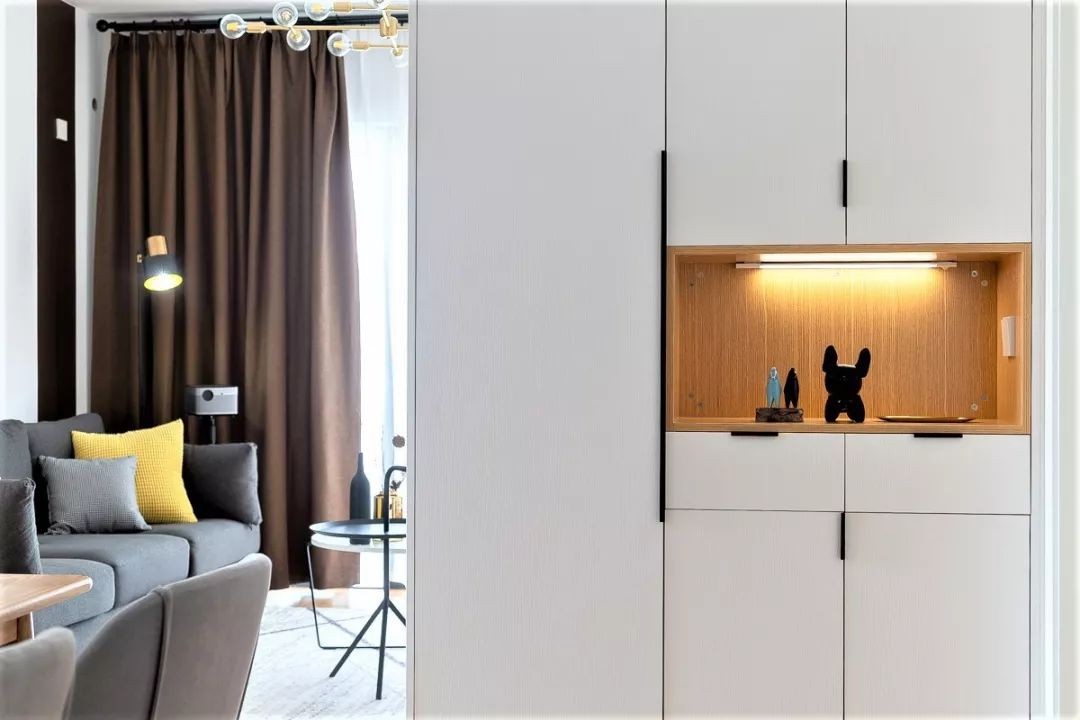 组合型玄关&储物柜,将原来的大开间,划分为客厅、餐厅两个独立空间,既增加全屋收纳,视觉上也有一定遮挡。玄关的感应灯,晚上回家不必抹黑