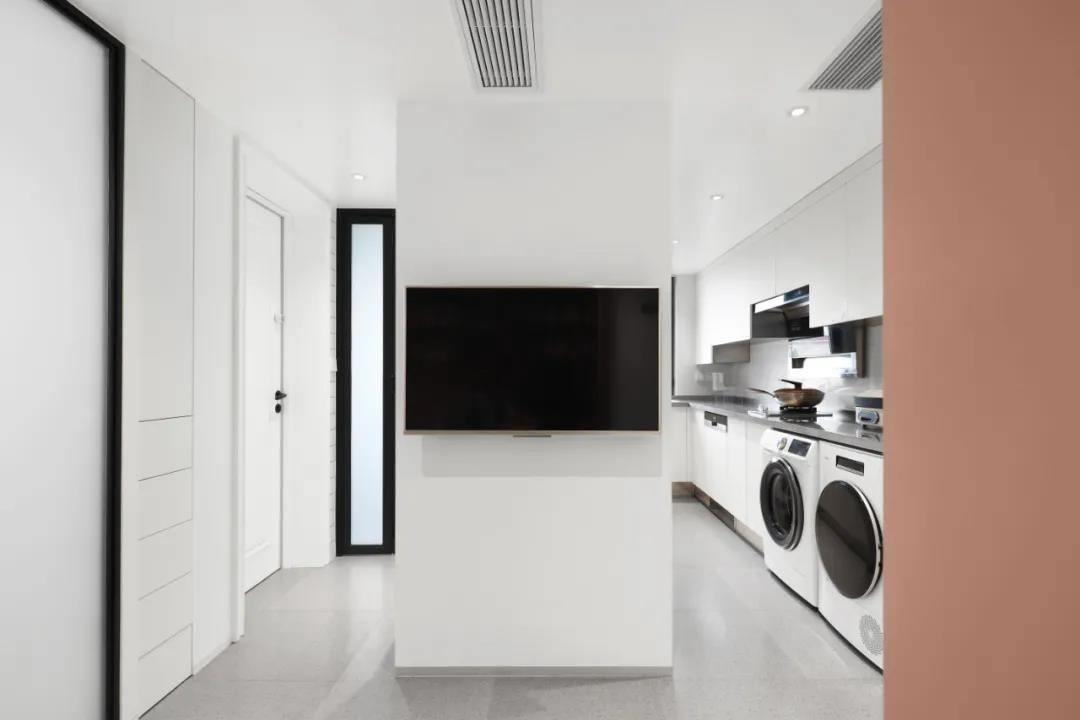 中间留出85cm宽的过道,两边都是操作台面和柜体,超大厨房两个人用都很宽裕。