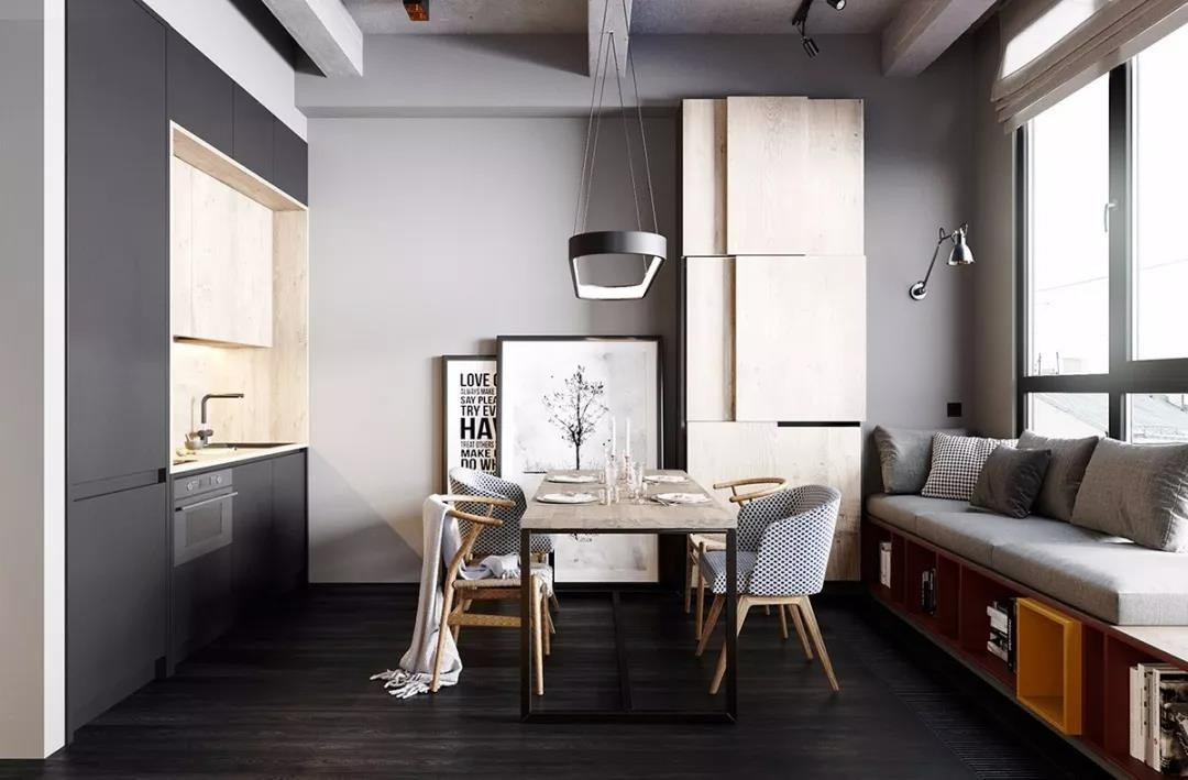 餐厨空间的水泥天花板搭配灰色、黑色为主的空间,让人感觉非常时尚。开放式的厨房虽然有些油烟问题,但国外的烹饪方式和国内差别很大,这点并不担心。