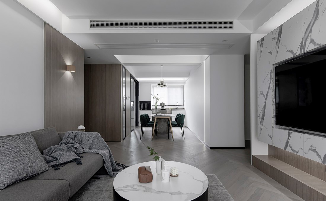 两室一厅一厨一卫,南北通透。整个家以经典的黑白灰为主色,同时加入胡桃木和金属元素,用材质本身的色调与肌理表达空间质感,简约却不乏精致,低调中透露温馨。