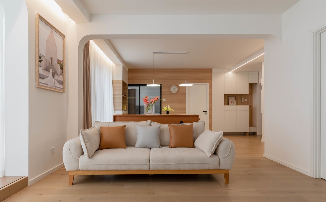 以乳白色墙漆和原木色家具地板为低色,布艺沙发增加舒适感。