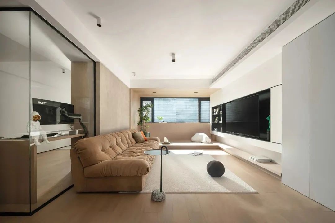 ▲ 开放式书房连通生活阳台。延续客厅的风格,顶面选择无主灯照明。与客厅局部以玻璃相隔,通透性更佳。原木书桌于木地板呼应。