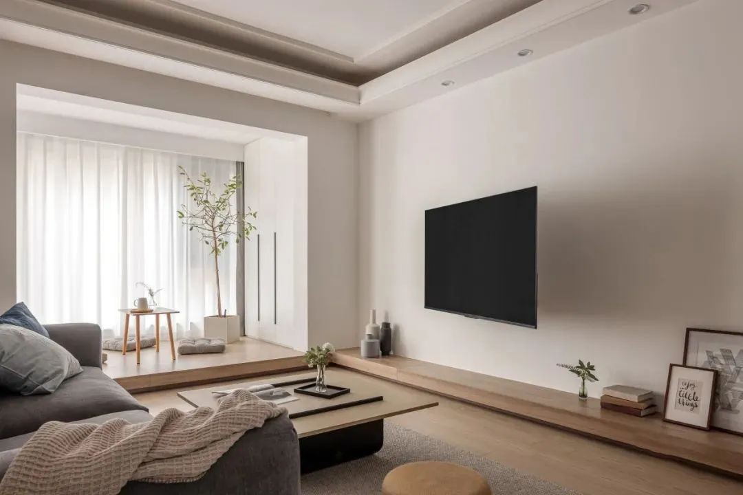 ▲ 电视背景墙简洁的造型,惬意的留白,空间灰色调和原木色调互相融合。电视机悬挂在墙中,下侧与阳台抬高做实木地台,方便又美观。