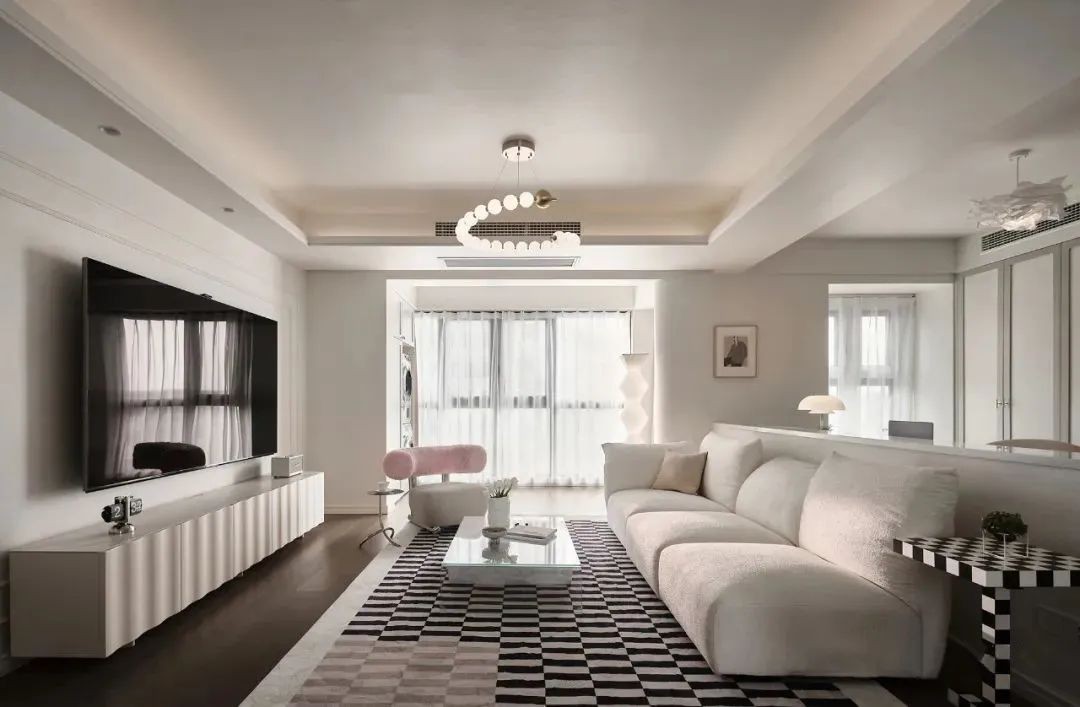 ▲ 客厅整体以白色为主色调,奠定简洁明媚的风格基调,落地窗的设计让整个空间明亮通透,地面铺贴棋盘格短绒地毯,增添时尚元素。