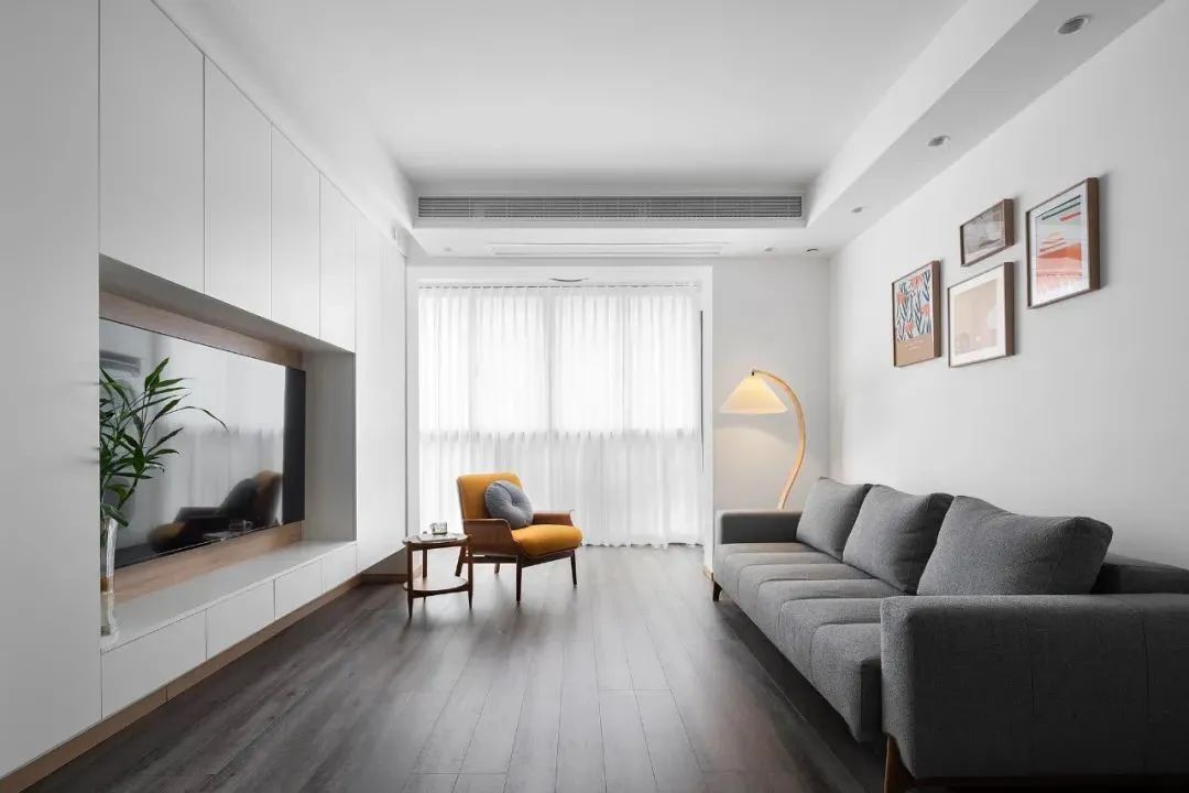 ▲ 客厅空间的整体基调是冷色系,搭配深色的木地板进行色彩协调,整个空间呈现出温婉柔和的空间氛围。嵌入式的电视柜,美感与实用性并存。