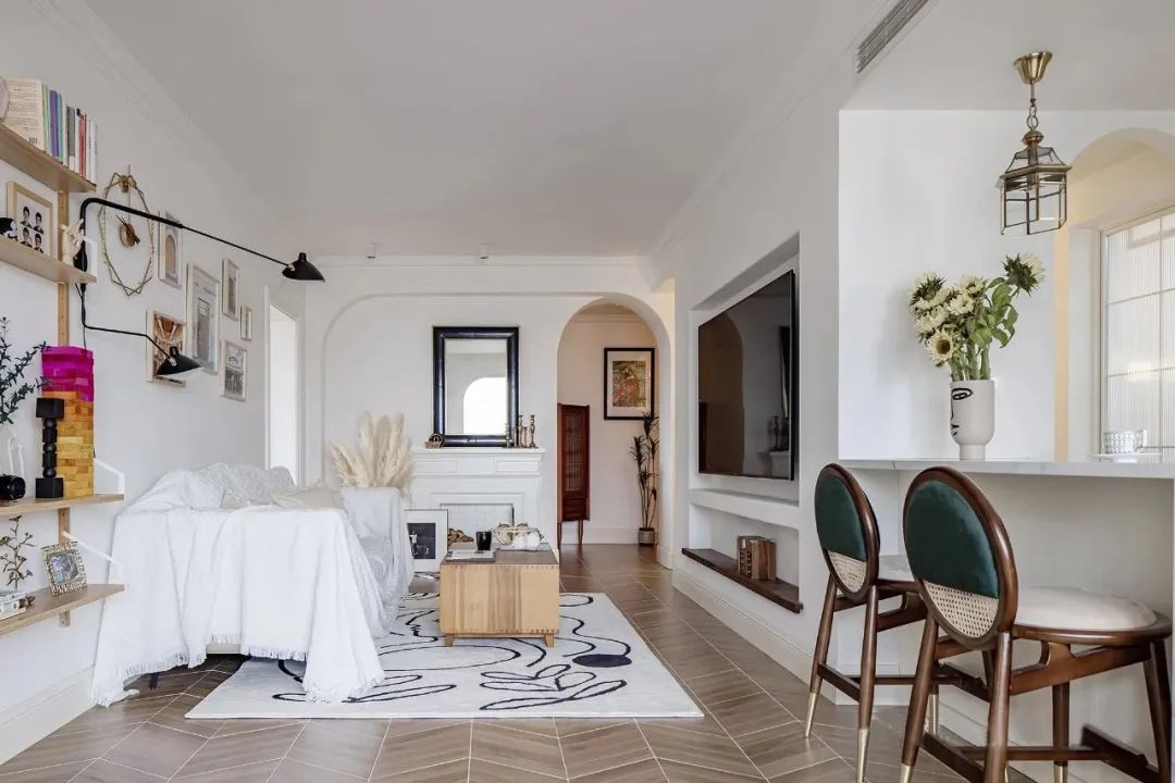 ▲ 原木鱼骨拼的地面铺满整个公区。奶白色的沙发搭配木质茶几,并定制了一墙隔板书架,增加收纳空间。背景墙以装饰画+摆件装点。