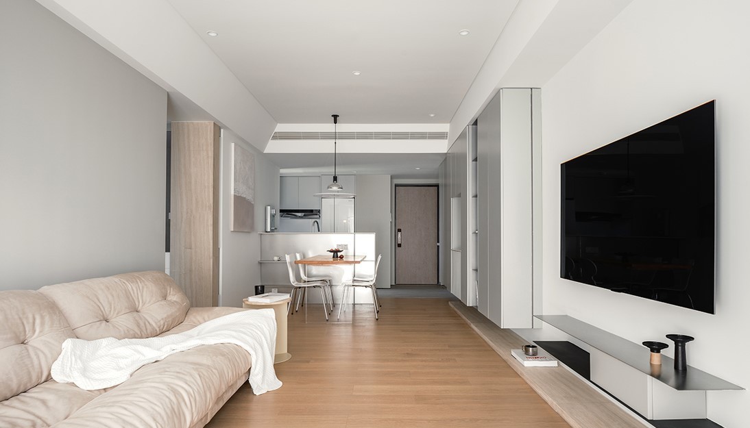 三居室,整体选用优雅的奶茶色做为主基调,结合消光金属与温润朴实的石材,使空间极具亲和力而又不失个性。
