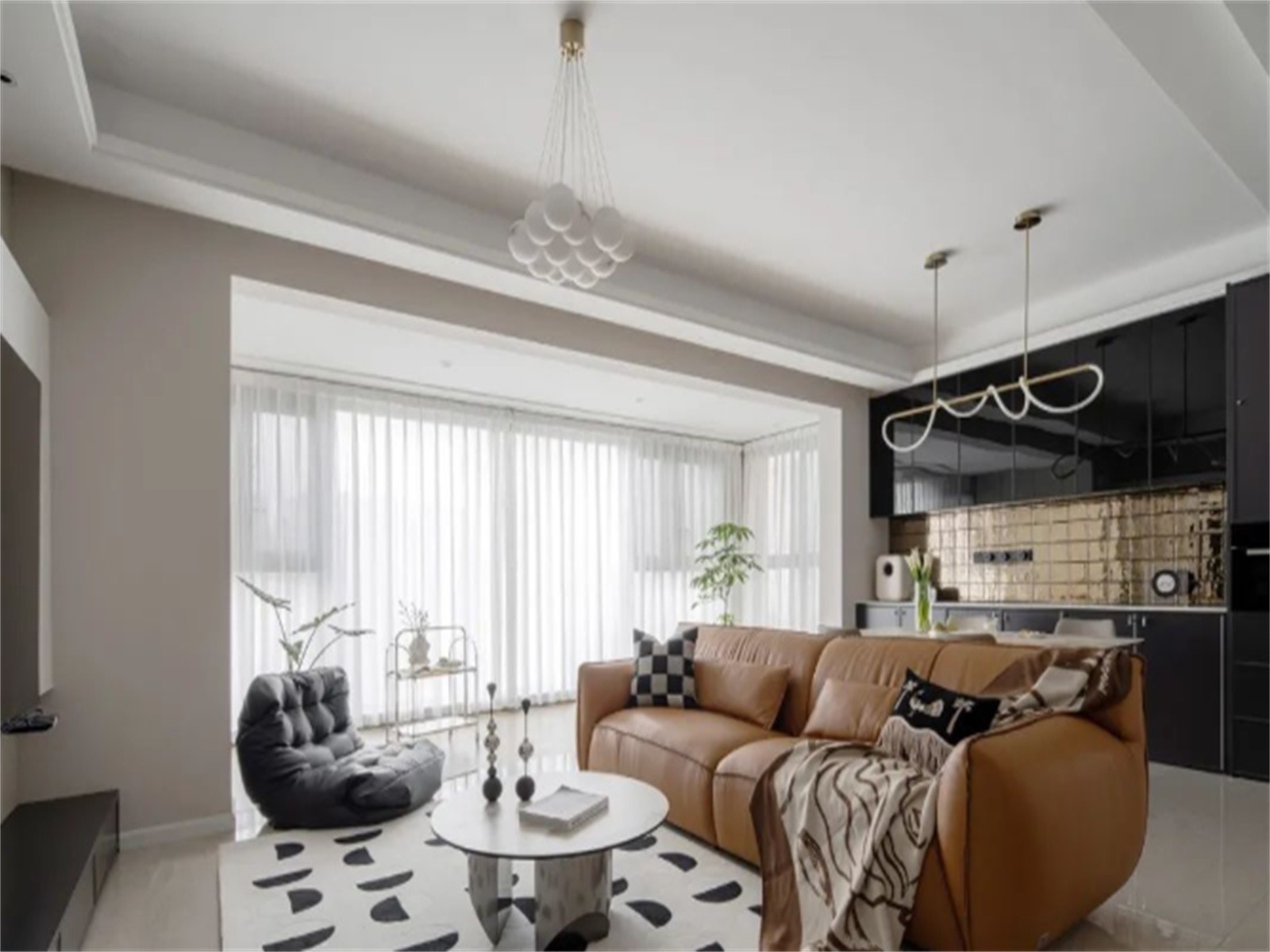 客厅,保留原始大横厅格局,打通阳台与客厅之间的推拉门,整个公区活动范围得以放大,主打法式奶油色,黑色局部点缀,让空间体积感充盈