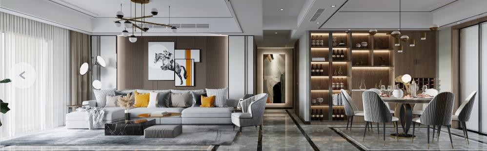 客厅以隐形门形式用木饰面和石材形式来完成电视背景