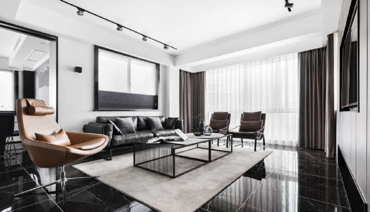 客厅原硬装墙布是米白色。为了整个黑白灰空间更加整体统一我们把部分墙面换成了灰色。搭配上金属线条,整个空间瞬间有了一种氛围感。黑色哑光沙发撞上同色系的家具,简约又舒适。