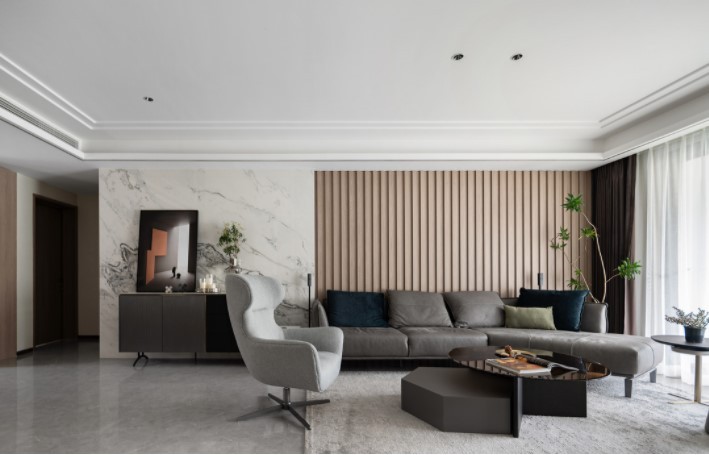 岩板的干净利落和格栅板的序列以及黄金分割来完成背景墙的打造。 转角沙发可做可躺, 让居住者的生活更多样