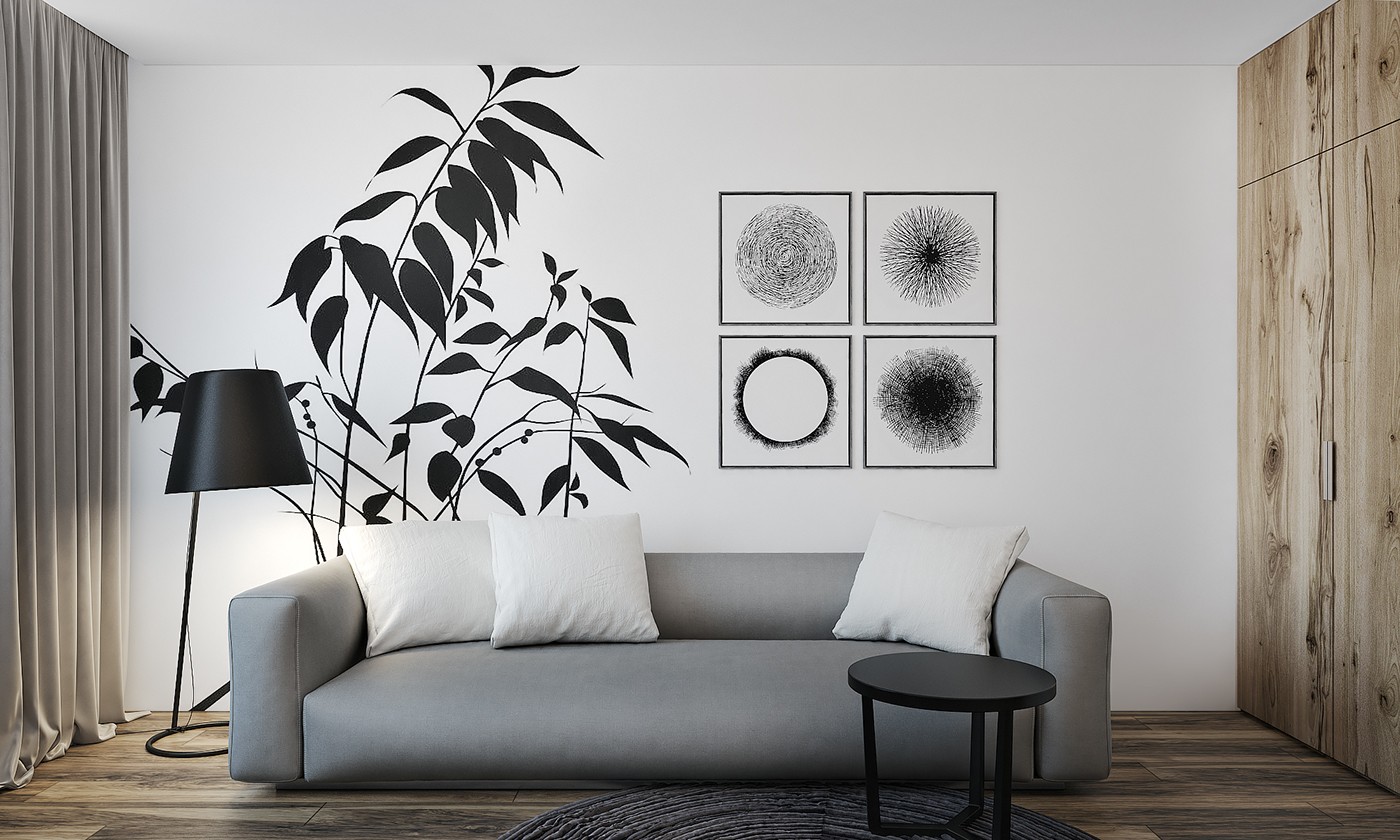 如墨一般的植物纹理在白色的墙壁上恣意生长,黑白映衬,显得黑色更加浓烈。灰色沙发搭配黑色台灯,显得素雅而洁净。