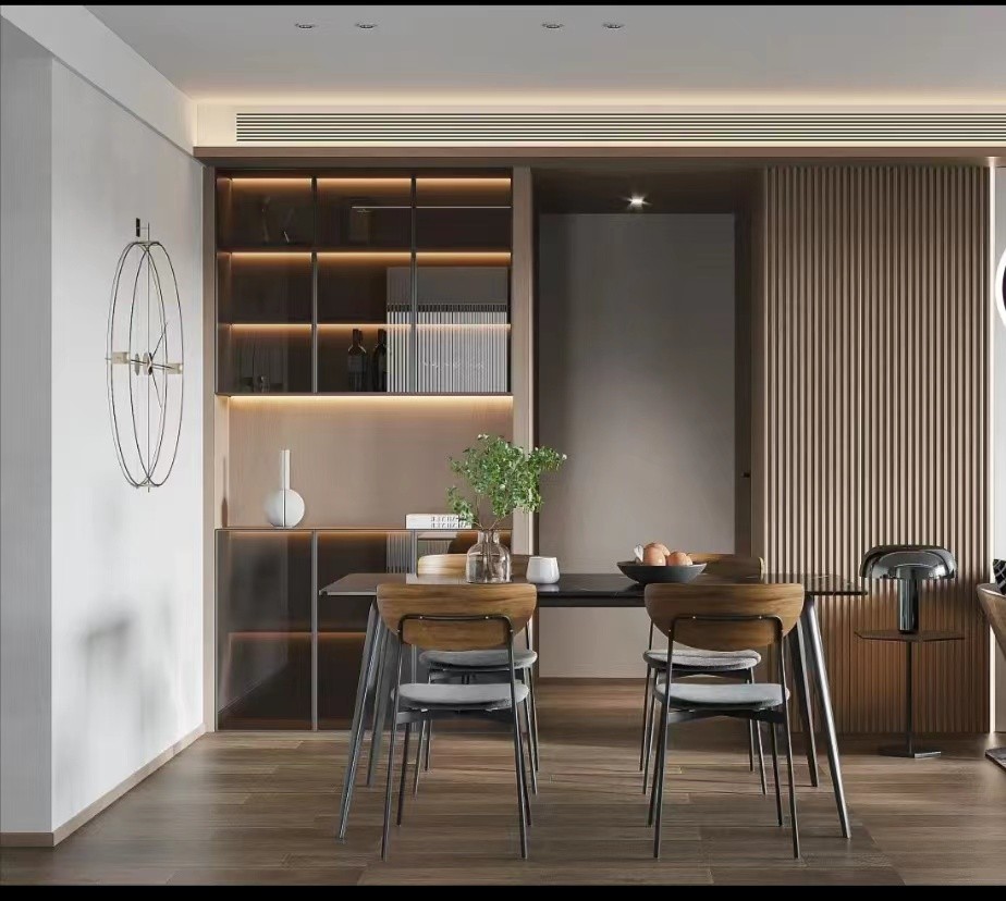 定制极窄玻璃门酒柜,搭配实木格栅背景墙
