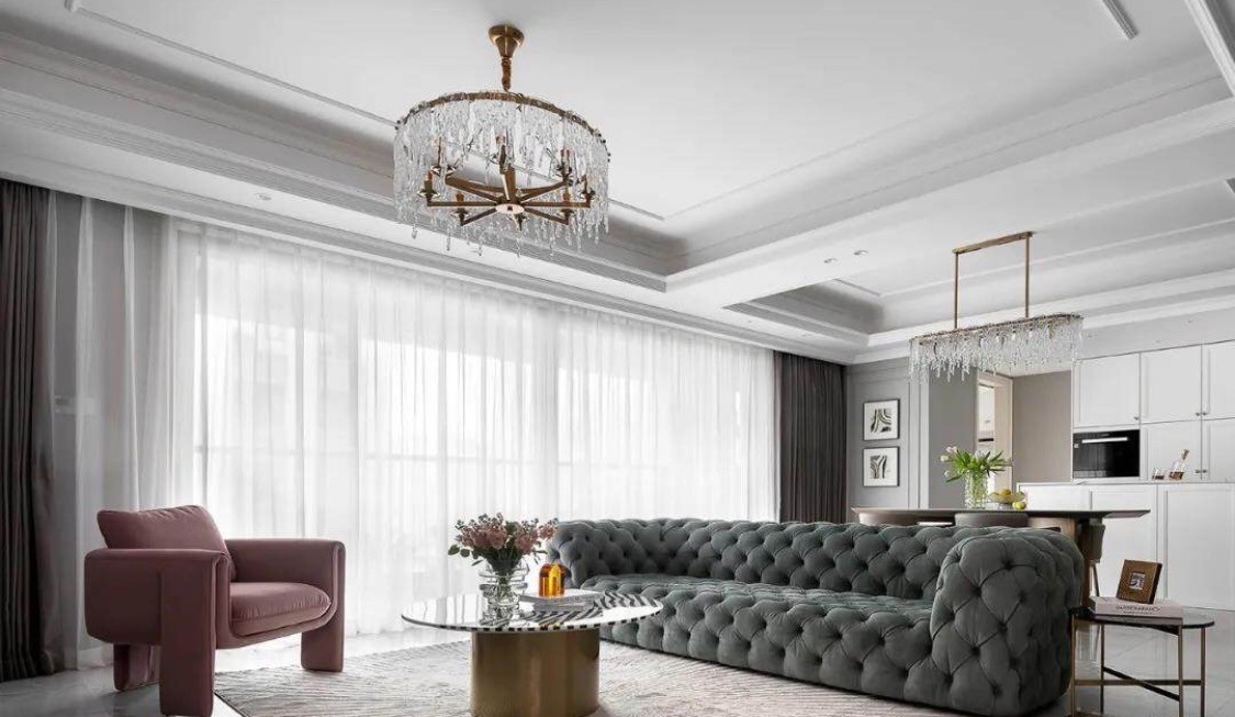 客厅的风格和谐大气,流畅的线条简约干净,墨绿色沙发搭配斑马纹茶几,给空间增添了一份艺术色彩。
