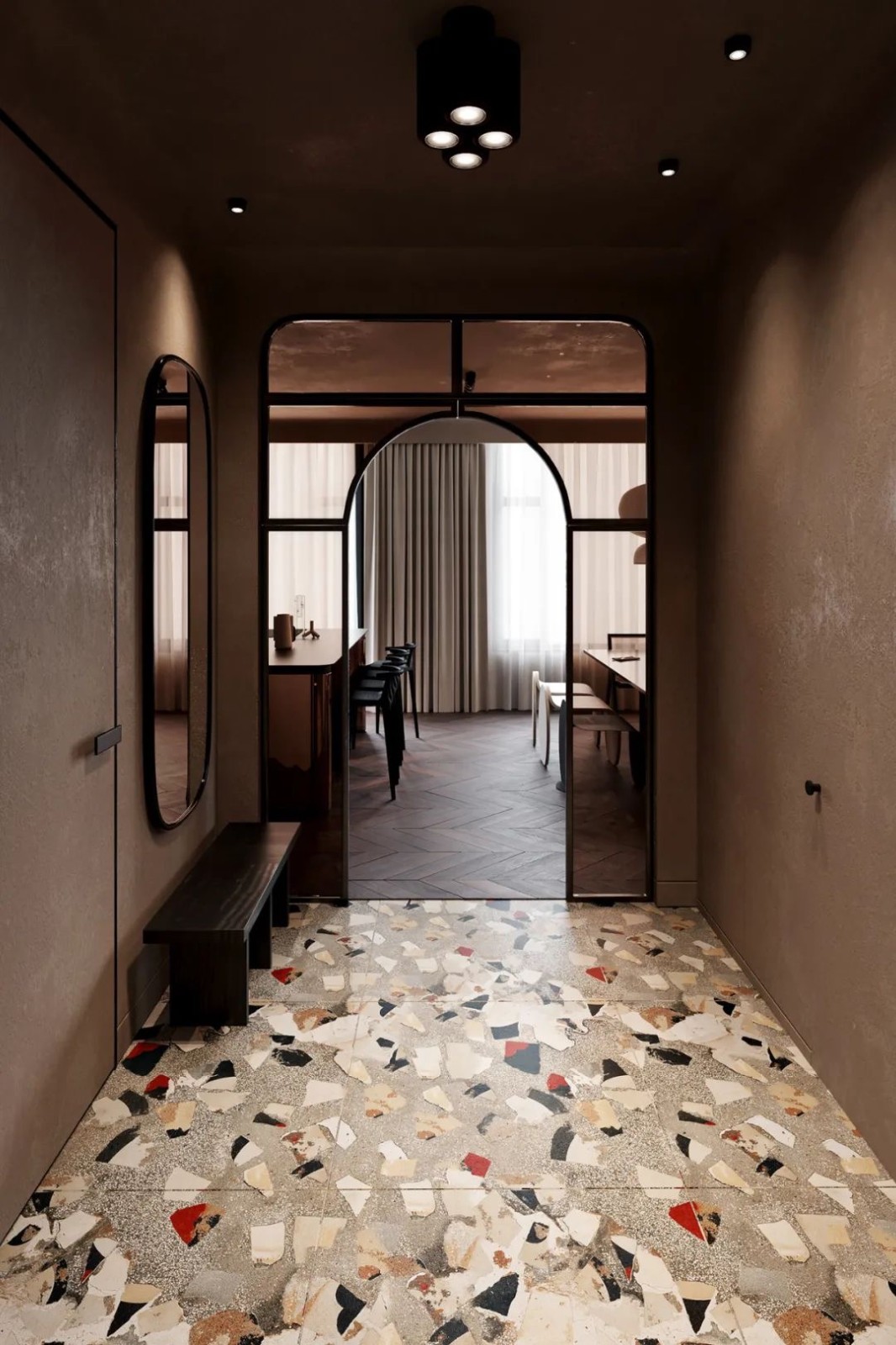 走廊是一个四处都可以抵达的公共区域,在这里分别可以到达客用浴室、衣柜、卧室、主浴室和主衣柜,而另一边则通向厨房、和餐厅。