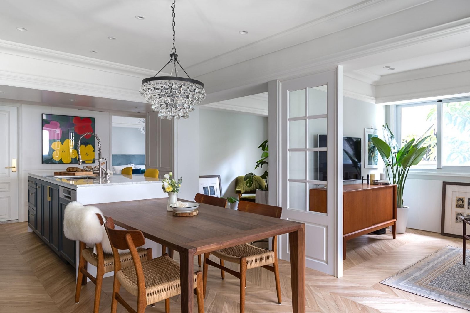 开放式厨房的设计,让空间更加开阔些, 餐桌直 接用整体橱柜来代替。