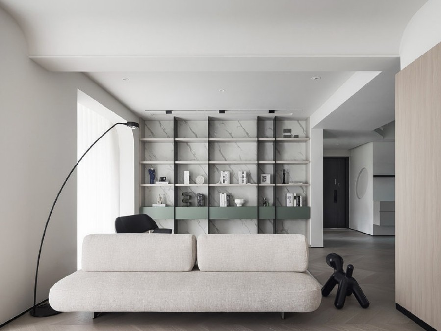 客厅主要以奶油色系为主,全木色家具,用莫兰迪绿色点缀。