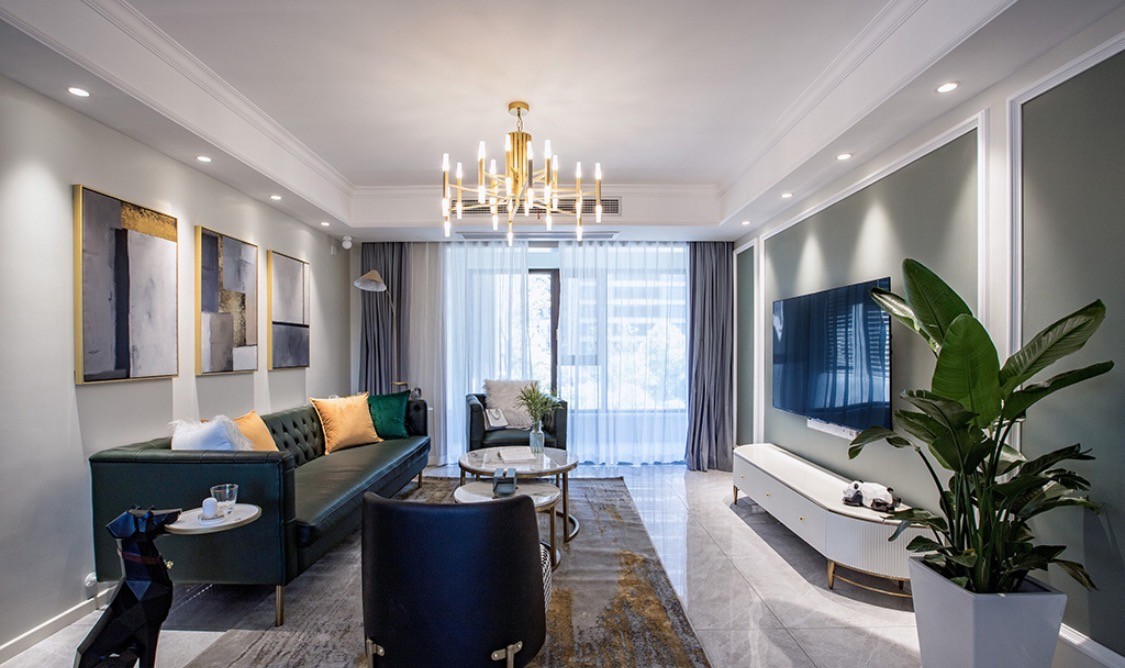 灰色地砖彰显现代质感,墙面以石膏线条做了一个框架效果,墙面深绿配浅绿,使得墙面更有层次感。
