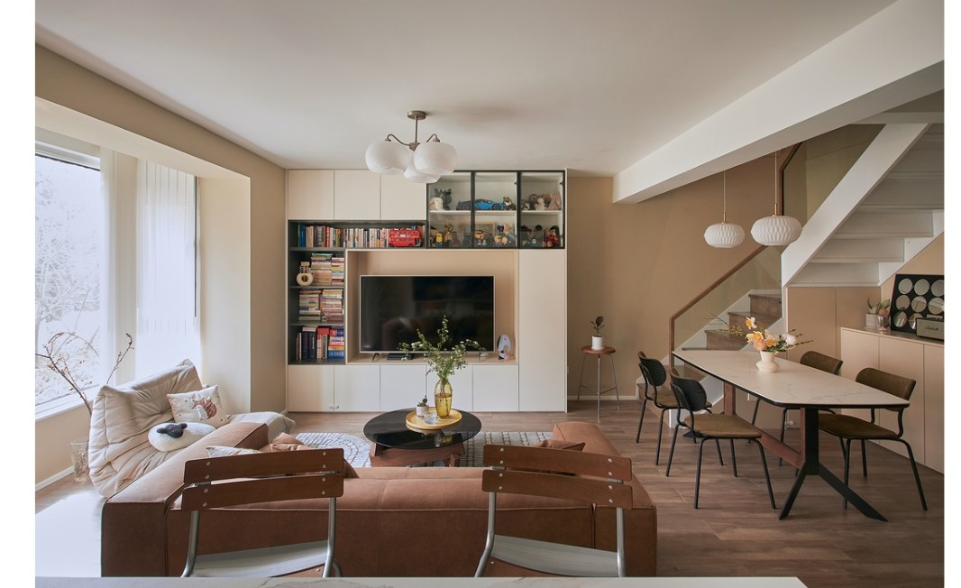 原硬装比较简单,墙、地、顶面重新处理后,为了增加储物空间,利用电视背景做了整墙收纳柜。 家里的书籍、手办、摆件等也都有了容身之所,同时也兼做家政柜,吸尘器等也整齐收纳至旁边高柜里。
