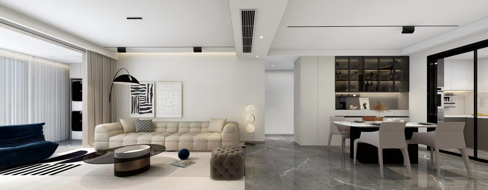 全景效果图 整体采用了现代元素黑白灰搭配无主灯设计方案