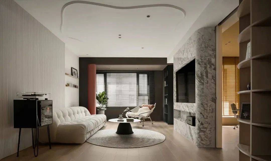 沙发背景墙 以波浪板包裹半墙,温润的原木地板铺贴延续,一角摆放着专属黑胶唱机的复古置物架,营造复古有格调的生活空间。