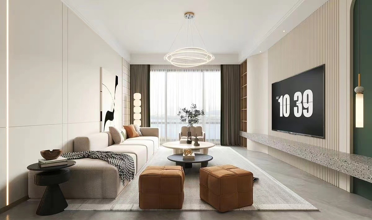 客厅整体采用暖色调搭配 电视墙采用悬空电视柜 满足美观同时也方便后期打扫卫生