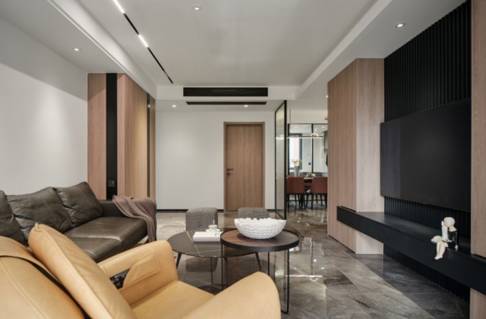 沉稳的大面灰砖、温暖的木饰面、富有质感的皮革沙发,勾勒出空间层次,营造出与居住者气质相契合的雅致氛围。