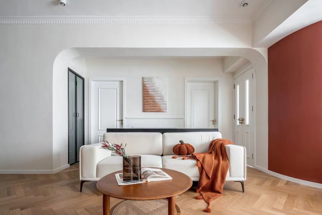 沙发上方做了双边拱,增加法式元素的同时弱化顶梁的存在感。地面通铺人字拼环保暖调木地板氛围感与仪式感满满。