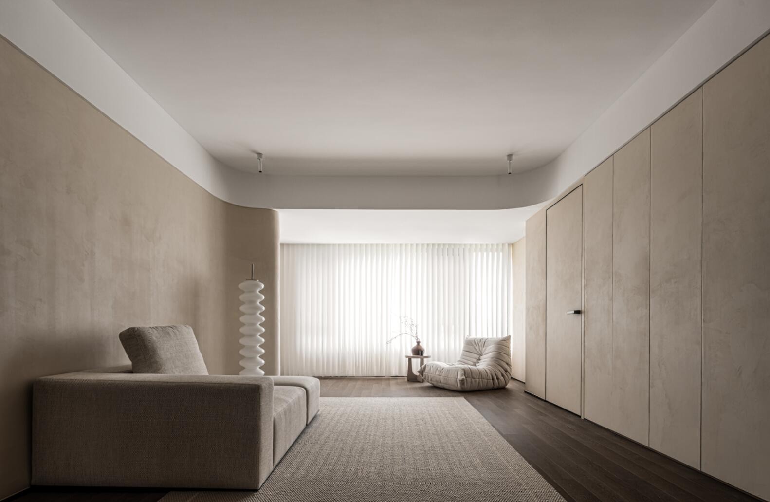 沙发的墙壁涂上了与电视柜相同的艺术涂料,儿童房再次通过无框门隐蔽。 艺术漆的独特质感表现,以及乳白色咖啡色的内在治愈,让空间散发出骨子里的温暖和品质。
