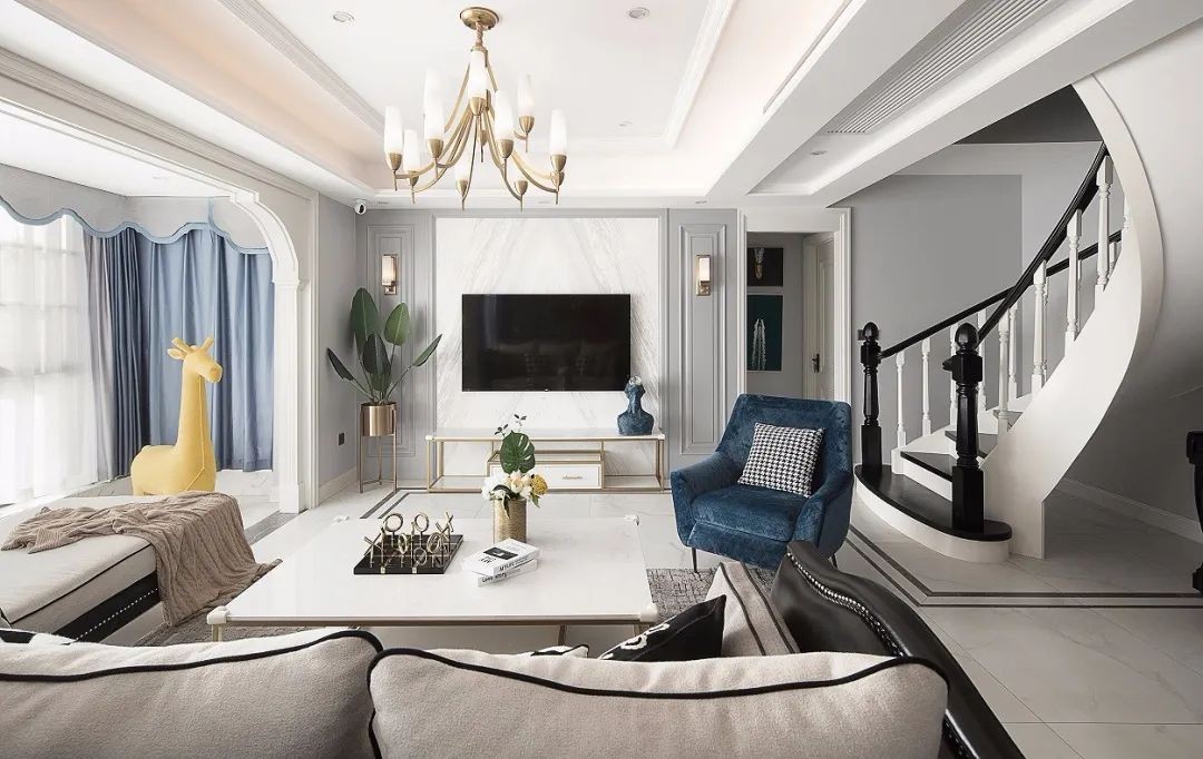 客厅以美式+轻奢风的混搭格调搭配,茶几是雅白的金属架+岩板台面组合,搭配黑色皮沙发、蓝色沙发椅,让客厅空间布置出一种优雅。