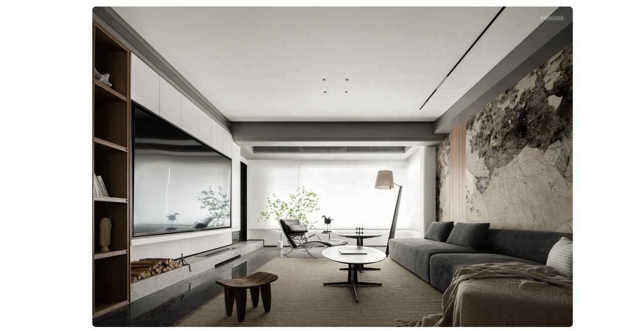 客厅的完整视角。无边框射灯+磁吸轨道的灯光设计,干净的顶面让空间很清爽。黑、白、灰、木色系的融合,显得***有质感。