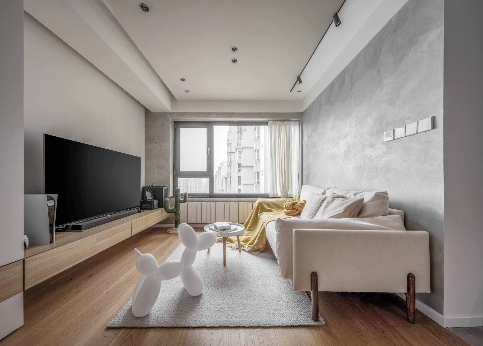 电视柜这边是采用了定制柜体来增大储物空间,电视柜做的悬浮形式,想知道怎么做的屋主可以关注私信或者留言,这个电视柜里面可以放置游戏设备,满足屋主需要在客厅打游戏的需求