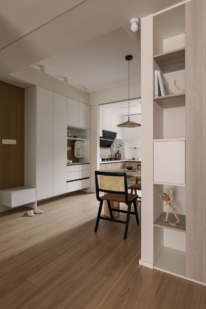 原始户型没有玄关,所以我们把进门功能区规划至餐厅一侧。多功能柜体集合了换鞋卡座、鞋帽收纳柜、餐边柜的功能。整个柜子做了挑空的设计,视觉上更加轻薄灵动。