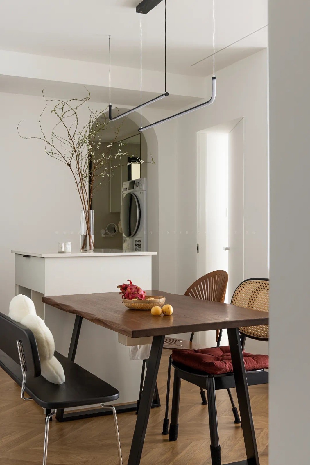餐厅的白色小吧台与木纹地板构造后现代简约时尚的风格